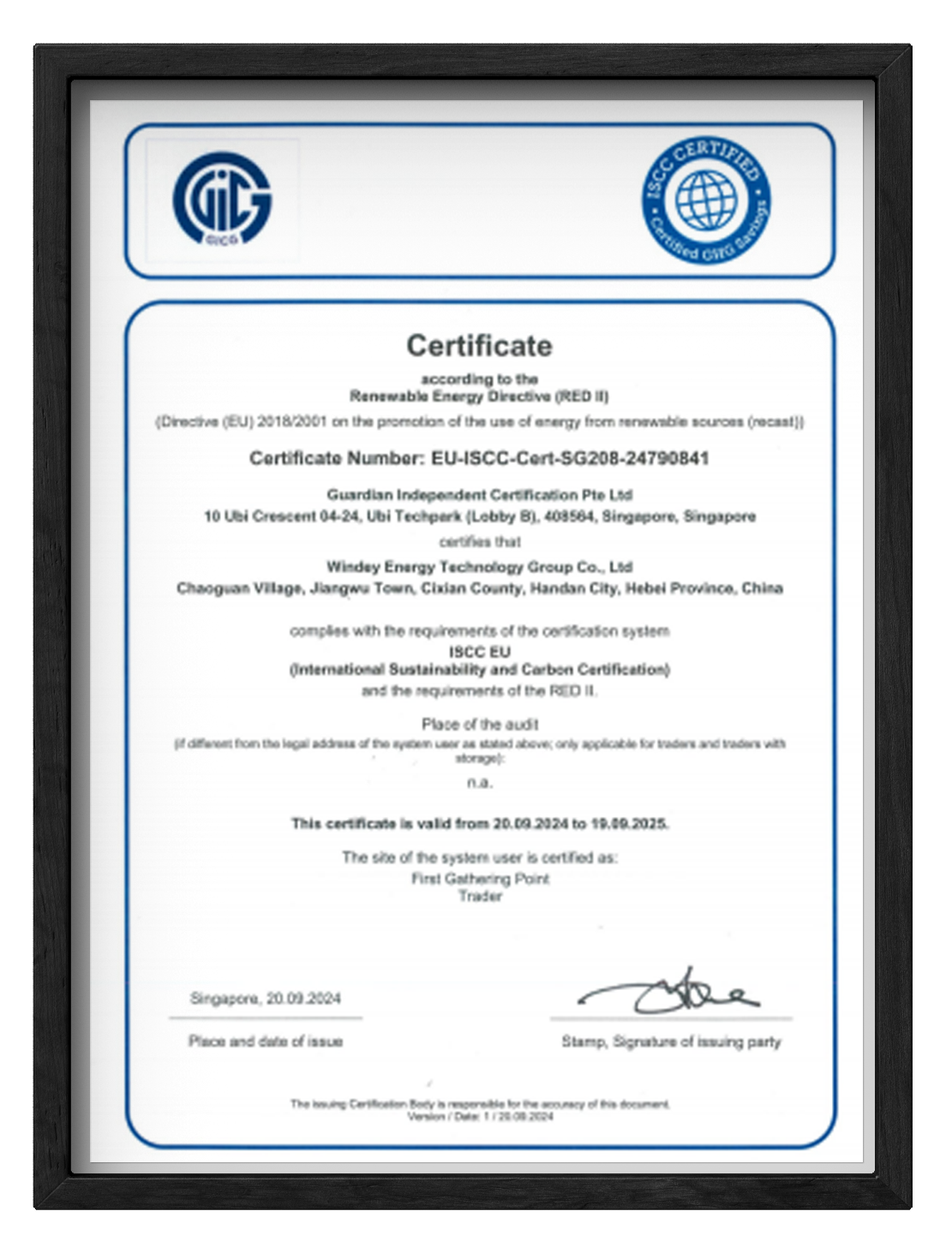 ISCC is a sustainability standard that is firmly grounded in European Union regulations. Its ISCC EU certification serves as a compulsory prerequisite for green products seeking access to the European Union’s energy market. This certification aligns with the European Union’s sustainability standards for various products, including biofuels, bio-liquids, and biomass fuels, as outlined in RED II. This certification will offer robust technical backing to WINDEY’s forthcoming endeavors in certifying its green methanol products.