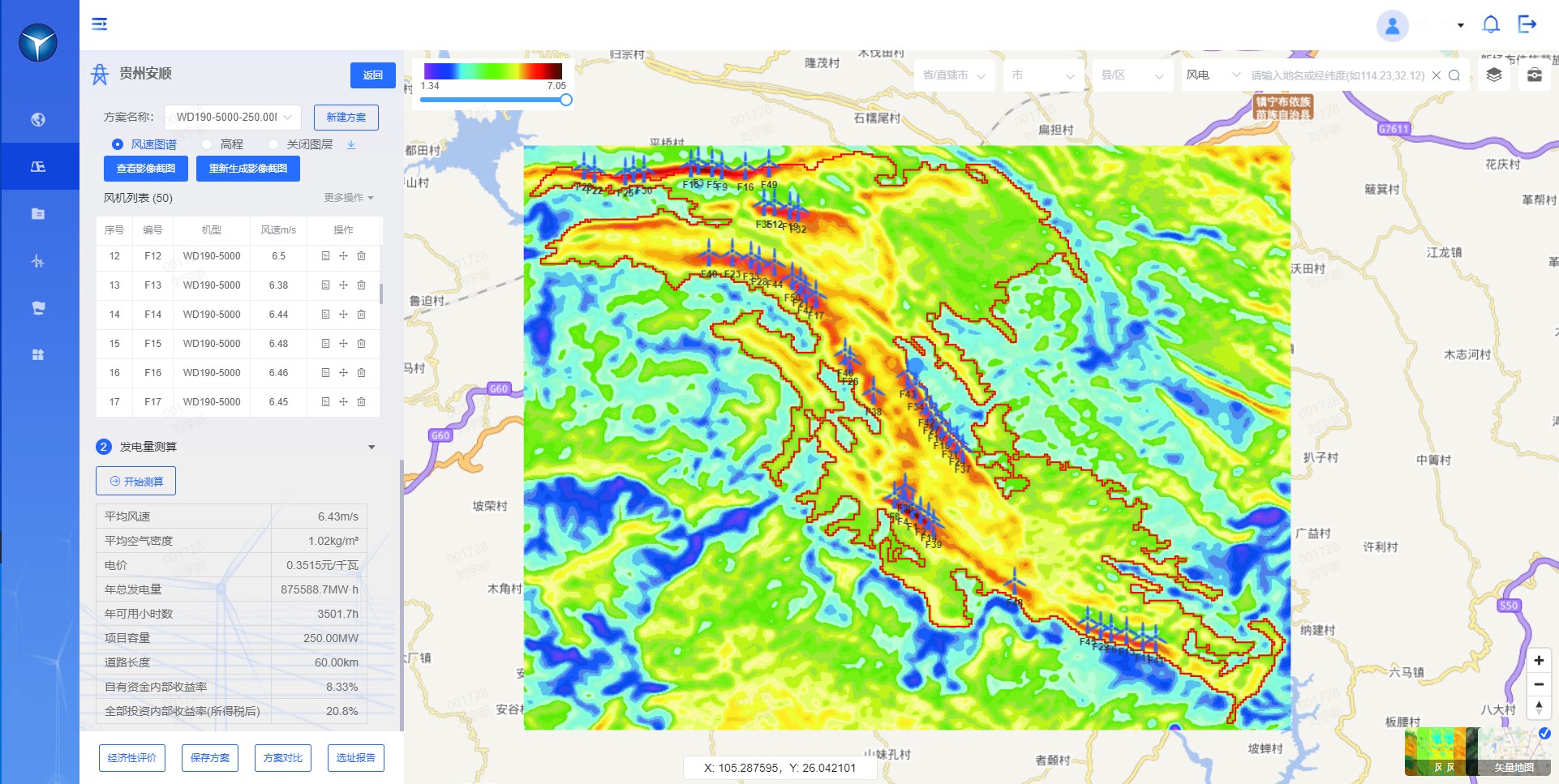 風(fēng)電場宏觀選址是指對一個(gè)區(qū)域內(nèi)的資源進(jìn)行普查,根據(jù)該區(qū)域內(nèi)的地形、地貌、氣象、土地利用規(guī)劃、經(jīng)濟(jì)性效益等方面進(jìn)行綜合評價(jià),選出適合開發(fā)的場址。如何快速準(zhǔn)確地定位優(yōu)質(zhì)開發(fā)區(qū)域,如何篩選出合適開發(fā)的范圍場址,如何得到詳盡完備的規(guī)劃設(shè)計(jì)方案,如何提前評估項(xiàng)目全生命周期經(jīng)濟(jì)性收益?對于以上問題,威尼斯9499登錄入口股份基于多年的風(fēng)電開發(fā)經(jīng)驗(yàn)和領(lǐng)先的數(shù)字化能力,打造了擁有自主知識(shí)產(chǎn)權(quán)、針對風(fēng)電場宏觀選址的規(guī)劃平臺(tái)軟件——“馭風(fēng) Wind Compass”。