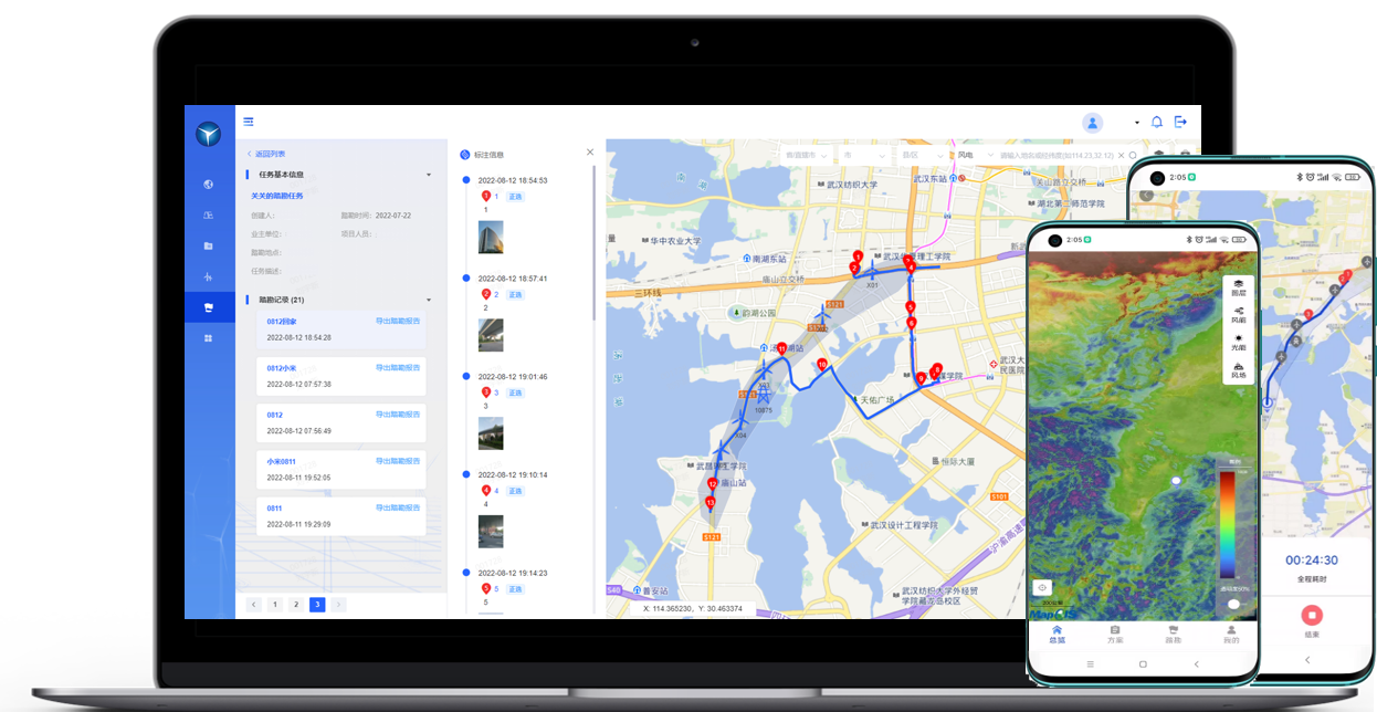 “紙上得來終覺淺,絕知此事要躬行”,對于已經(jīng)規(guī)劃好的方案,需要進(jìn)行現(xiàn)場實(shí)地踏勘,復(fù)核點(diǎn)位有效性,進(jìn)行更改或者微調(diào)以確保最終建設(shè)方案的可行性。馭風(fēng)移動(dòng)端內(nèi)置離線天地圖(包含衛(wèi)星影像)、資源圖譜、項(xiàng)目方案資料,可根據(jù)初步方案逐個(gè)點(diǎn)位進(jìn)行考察,利用GPS定位、地理信息查詢、風(fēng)參數(shù)查詢、踏勘軌跡記錄、圖文影像標(biāo)注等功能記錄每個(gè)點(diǎn)位周邊的環(huán)境情況、建設(shè)條件、道路條件等情況,為后續(xù)施工建設(shè)做信息儲(chǔ)備。在全場踏勘結(jié)束后會(huì)自動(dòng)生成踏勘報(bào)告并將踏勘任務(wù)同步至Web端,實(shí)現(xiàn)雙端聯(lián)動(dòng),用戶可以在任意設(shè)備靈活查看、分享記錄。