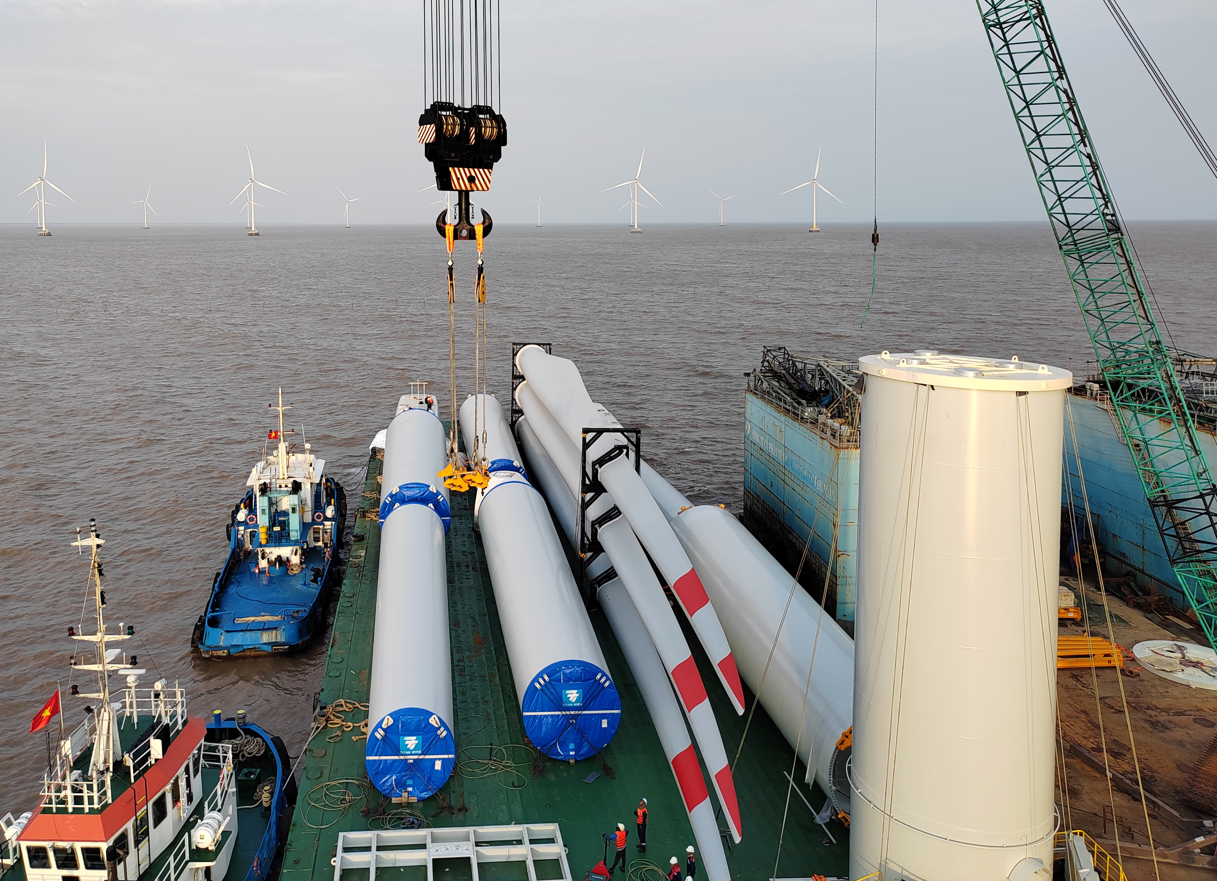 由于越南海域從12月開始進入大風(fēng)季,陣風(fēng)最大可達(dá)17米/秒,浪高達(dá)到2米,給項目運輸和施工帶來巨大考驗。同時,因海上風(fēng)電機組塔內(nèi)設(shè)備較陸上機組為多,首段塔筒需在陸地上完成預(yù)組裝,直立運輸?shù)綑C位,在超高、超重情況下,運輸難度直線上升,再加上施工窗口期較短,給現(xiàn)場作業(yè)帶來了極大地挑戰(zhàn)。