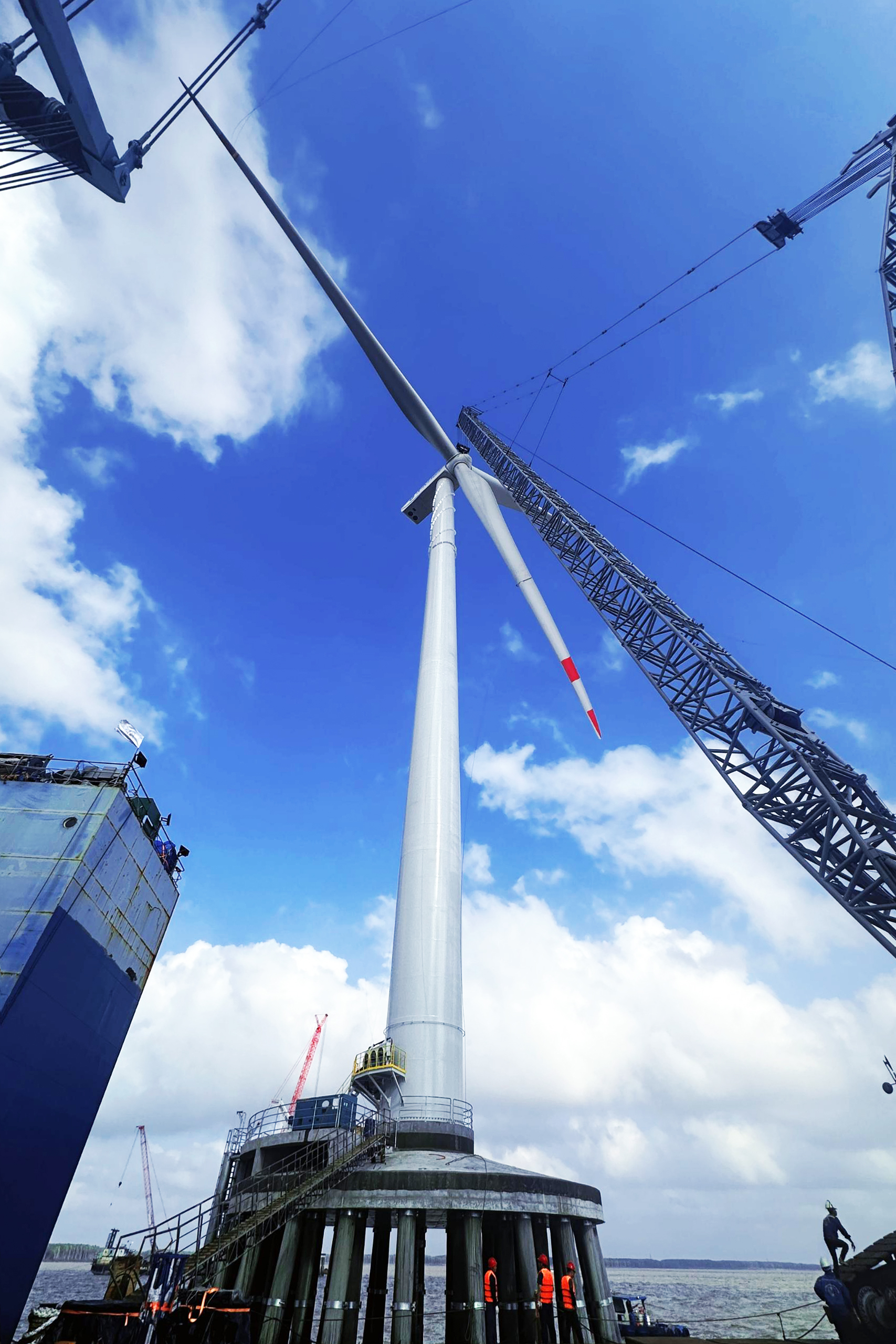 項(xiàng)目吊裝期間,越南海域進(jìn)入大風(fēng)季,陣風(fēng)最大可達(dá)17米/秒,浪高達(dá)到2米,本來(lái)施工窗口期就短,再加上海上風(fēng)電機(jī)組塔內(nèi)設(shè)備較陸上機(jī)組多,首段塔筒需在陸地上完成預(yù)組裝,直立運(yùn)輸?shù)綑C(jī)位,在超高、超重情況下,運(yùn)輸?shù)跹b難度可謂直線(xiàn)上升。